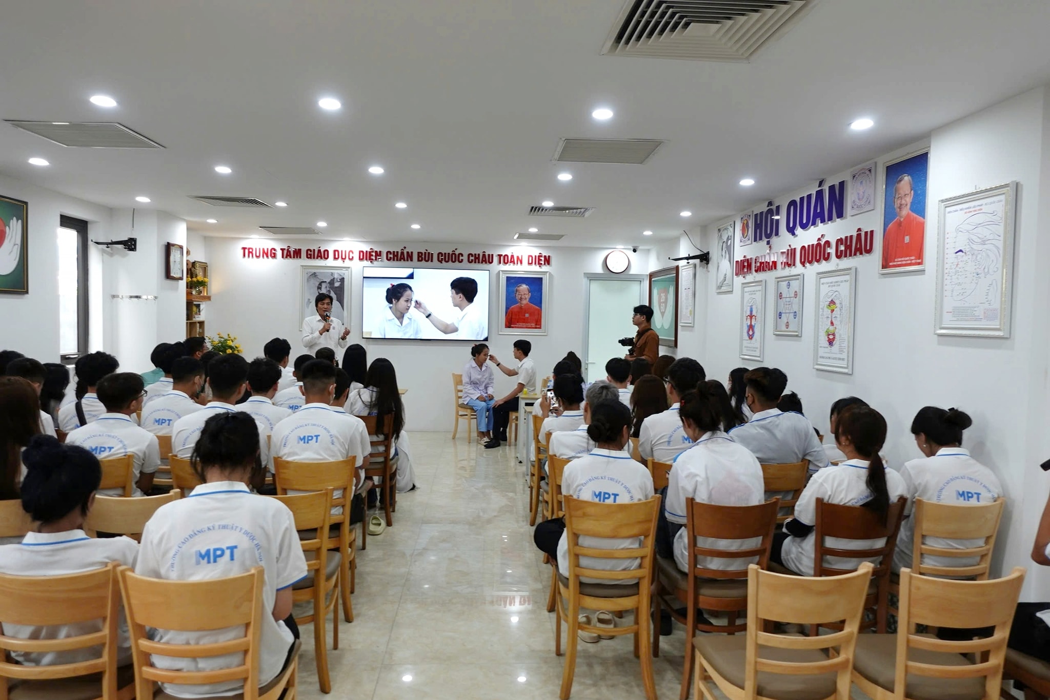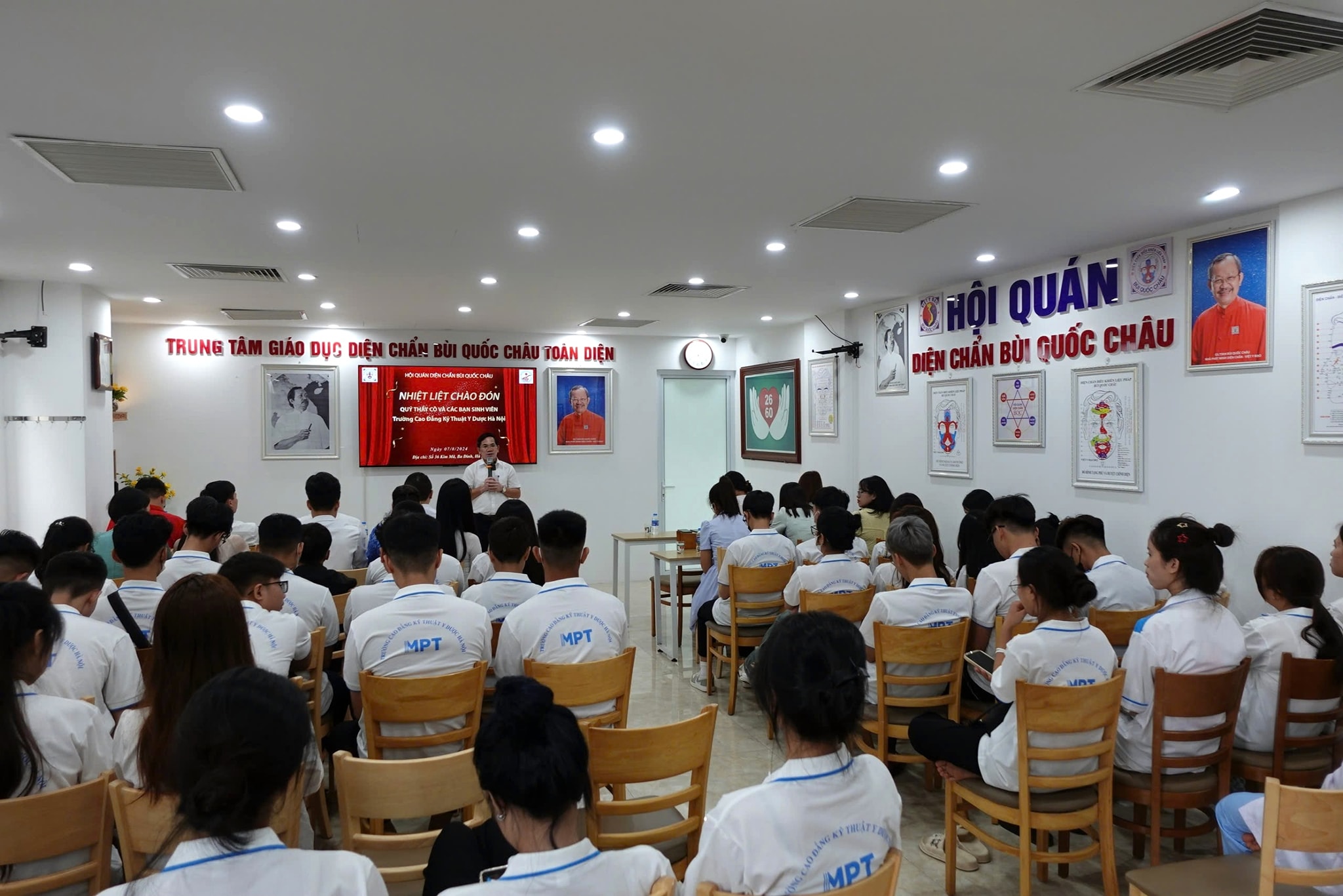 Sáng nay (7/8), hơn 70 thành viên của trường Cao đẳng Y dược Hà Nội đã tới tham quan, trải nghiệm các chương trình và hoạt động của Hội quán Diện Chẩn Bùi Quốc Châu trong khuôn khổ chương trình hợp tác giữa Hội quán và Nhà trường tại 36 Kim Mã.