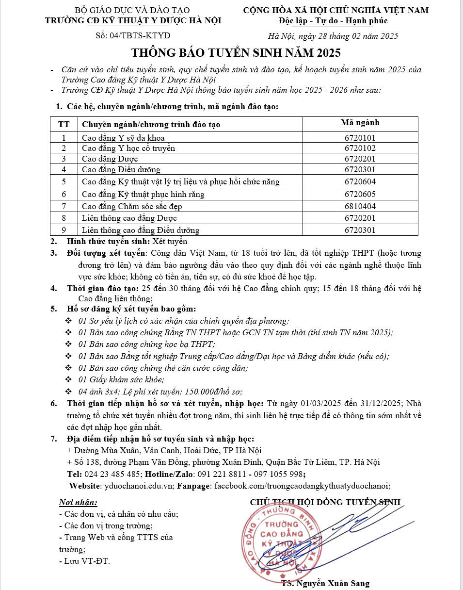 Hội đồng tuyển sinh trường Cao đẳng Kỹ thuật Y Dược Hà Nội thông báo tuyển sinh hệ Cao đẳng chính quy, Cao đẳng liên thông năm 2025: